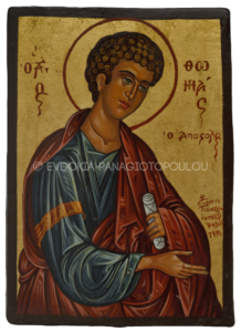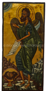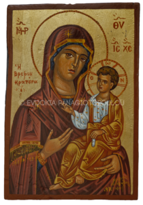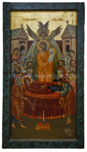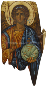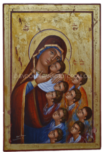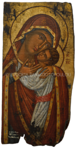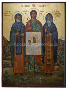 An original composition depicting the Saints of the Nisyros island, holding the picture of Mary: Saint Ionas, Saint Nikitas and Saint Gregorios.